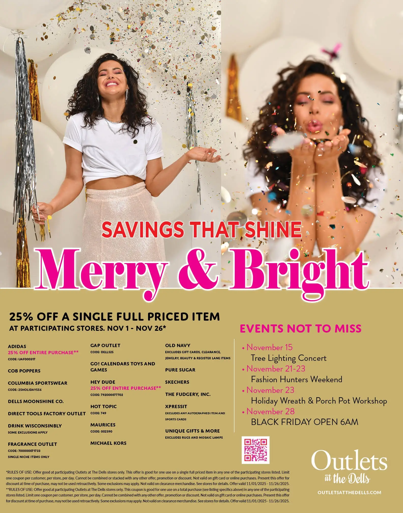 *RULES OF USE: Offer good at participating Outlets at The Dells stores only. This offer is good for one use on a single full priced item in any one of the participating stores listed. Limit one coupon per customer, per store, per day. Cannot be combined or stacked with any other offer, promotion or discount. Not valid on gift card or online purchases. Present this offer for discount at time of purchase, may not be used retroactively. Some exclusions may apply. Not valid on clearance merchandise. See stores for details. Offer valid 11/01/2025 - 11/26/2025.